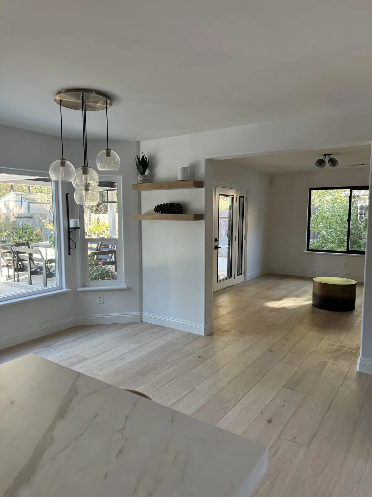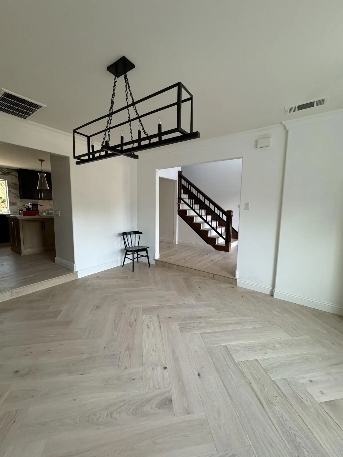 This project featured a combination of straight-laid hardwood flooring and a herringbone pattern, creating visual contrast while keeping the interior cohesive.