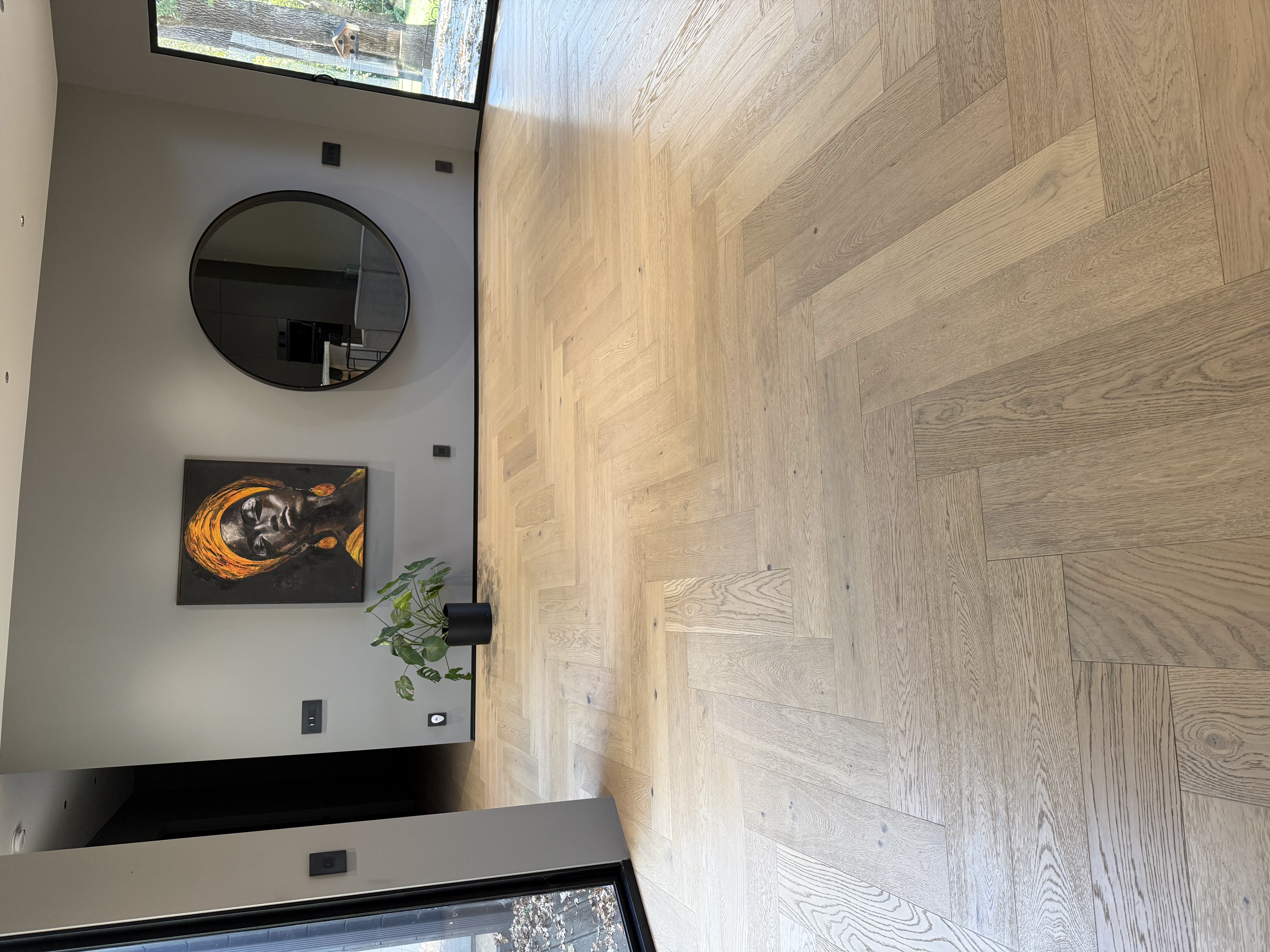 For this project, we completed a full hardwood flooring installation throughout the home. The main living areas feature a classic herringbone pattern, while the remaining spaces were installed in a clean, straight layout to maintain balance and flow across the interior.
